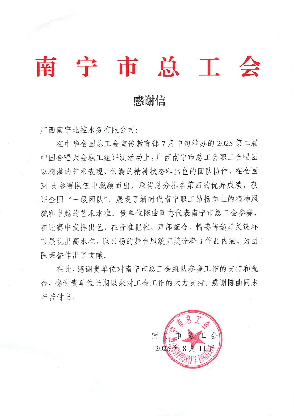廣西南寧北控水務有限公司獲南寧市總工會致信表揚2025-08-25